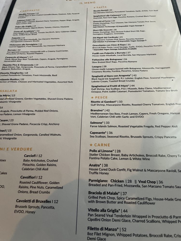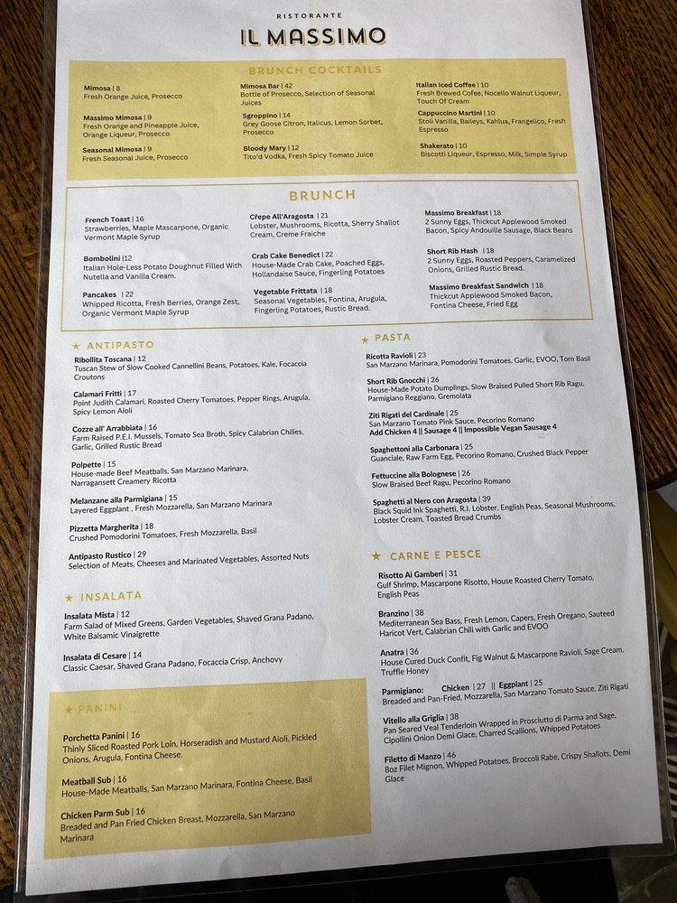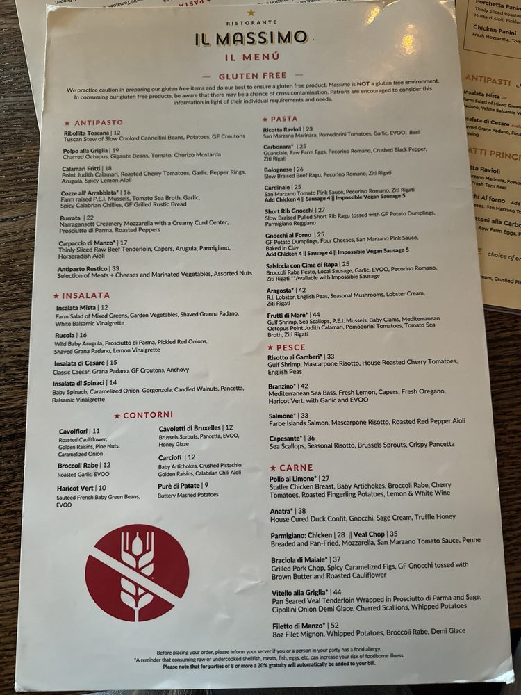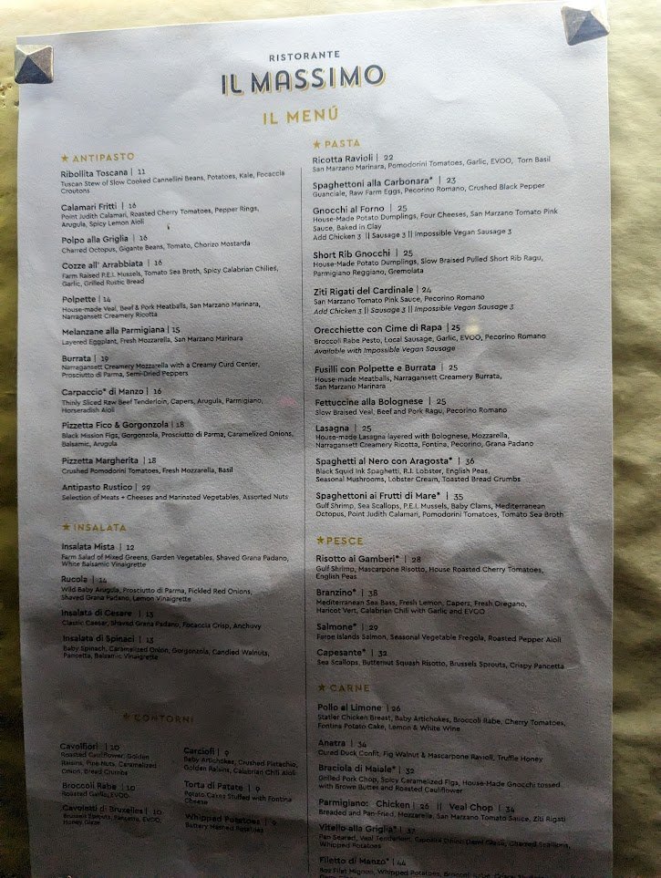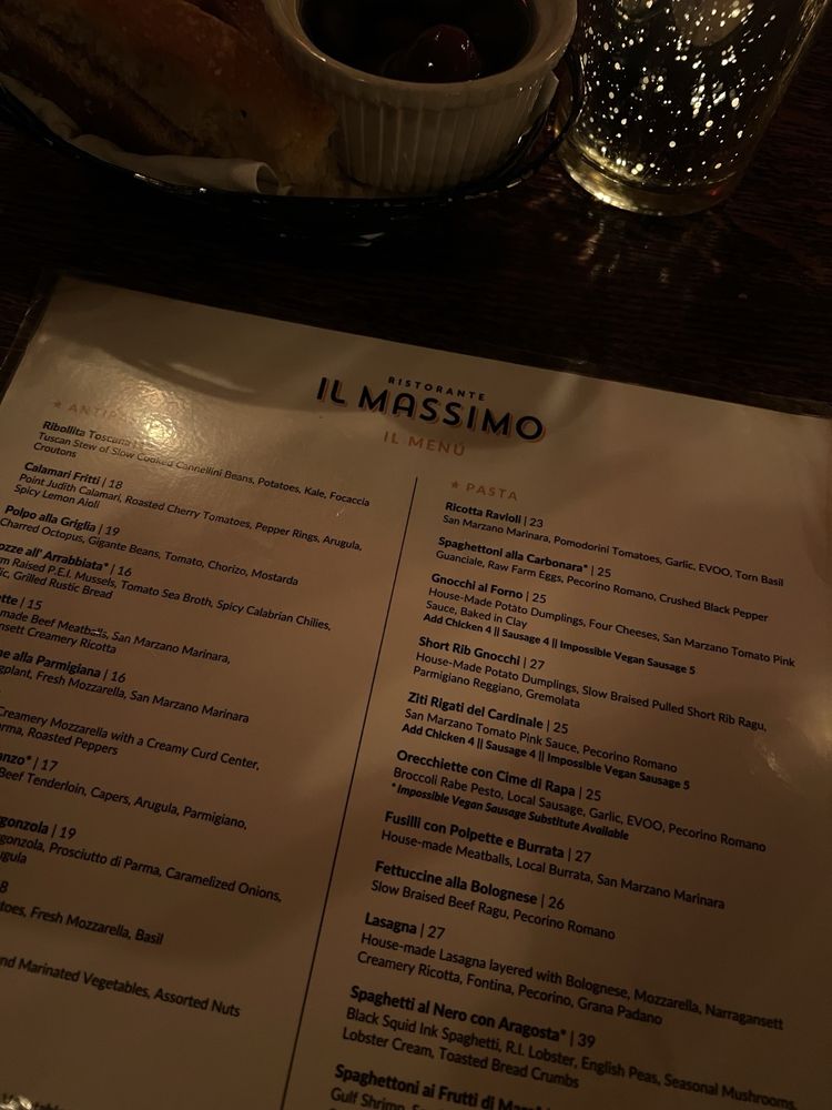 Introducing the menu at Massimo Restaurant, located in Providence, Rhode Island. This Italian bar offers a variety of dishes with vegan and vegetarian options, taking reservations and offering takeout. The starters include Ribollita Traditional Tuscan Stew, Antipasto selection, Calamari Fritti, and more. Sandwiches and pizzas like Margherita and Gorgonzola & Fig are available. Pasta lovers can indulge in dishes like Short Rib Gnocchi, Four Cheese Gnocchi, and Ricotta Ravioli. Customers praise the attentive service, delicious food, and extensive gluten-free options. The ambiance is described as classy and upscale, with a vintage vibe downstairs. An exceptional wine list and creative cocktails enhance the dining experience at Massimo Restaurant. The restaurant also provides various convenient amenities like free valet parking, gender-neutral restrooms, and QR code menus for a modern touch.